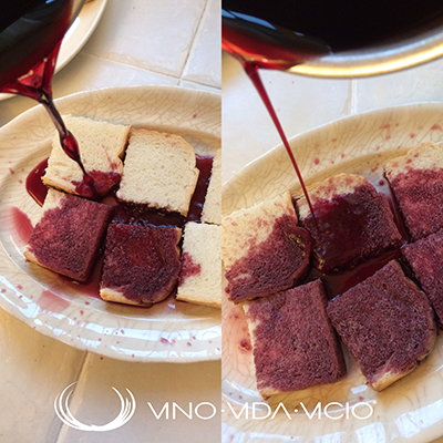 Y ahora viene lo bueno. Mezclar el pan con el vino, como dicen dice la “Biblia”, el cuerpo y la sangre de Jesús en contacto. Para hacerlo más cómodo, colocamos las rebanadas en una fuente un poco onda para poder echar encima el vino aromatizado con canela y cáscara de limón. El rojo sangre empapa lentamente el pan, convirtiéndose en uno sólo.